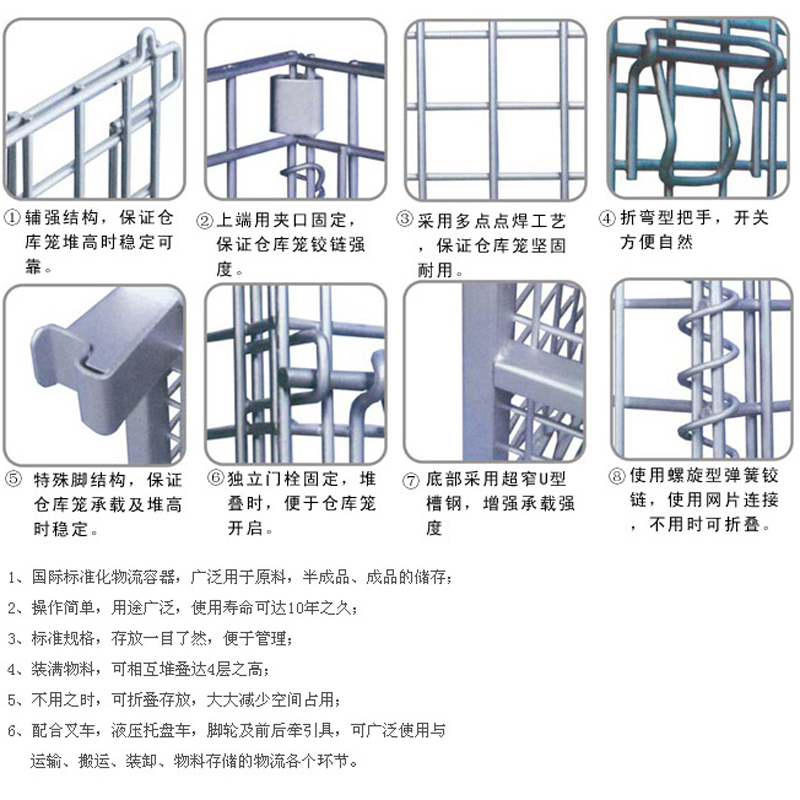 倉儲籠又叫倉庫籠、蝴蝶籠,是倉儲運輸中很重要的一類物流容器,具有存放物品容量固定、堆放整潔、存放一目了然、便于庫存清點等優(yōu)點,同時也提高了倉儲空間的有效利用率。此外,該產(chǎn)品堅固耐用、運輸便捷、能重復(fù)使用,能有效降低倉儲企業(yè)的人力消耗及包裝成本。此產(chǎn)品不僅可以用于工廠生產(chǎn)車間,而且可以用于超市作為展示促銷和倉儲,且可以在戶外使用。經(jīng)過改進的倉儲籠可放于貨架、流水線,也可堆垛:帶輪子的倉儲籠可在車間方便快捷周轉(zhuǎn),帶有PVC板或鐵板的倉儲籠可防止小件漏掉。