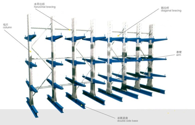 The cantilever rack is composed of columns, beams and cantilever column. The column uses the automatic pre filling hole rolling standard Shuangpin C type special type steel as column, to 200, 140 I-steel as the bottom beam, beam column using special ladder board and use of high-strength bolt connection. The cantilever beam is double hem in C welding. Cantilever beam and column galvanized plate connecting pin. Connection between column groups. (pillar with H steel or cold rolled steel cantilever, square tube, cold rolled steel or H steel. The cantilever and the connection between column using plug or bolt, the base and the connection between column by bolts). More than one load of up to 1000kg, especially reinforced column structure, can withstand the pressure of 2000~3000kg. Composite structure, special section steel column, the design of back pull increase stability, high strength cantilever (arm for one-sided or two-sided), with light structure, good load capacity, space utilization rate higher characteristic.