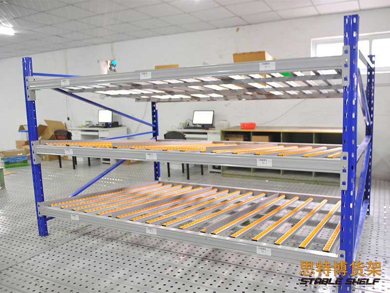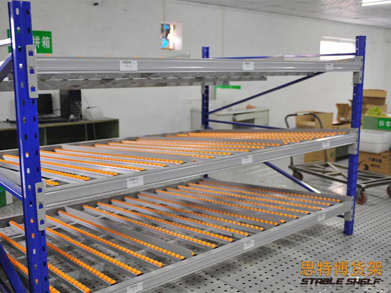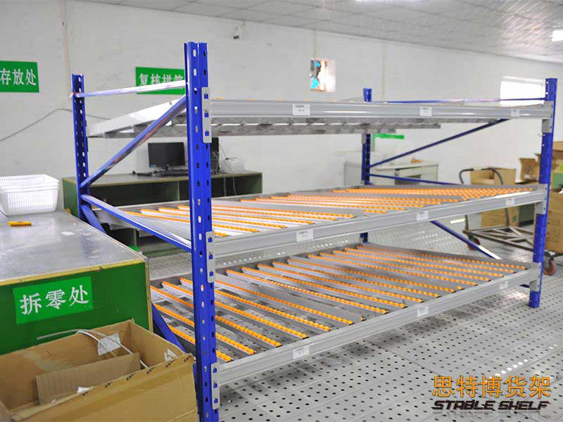 Fluent shelves are widely used in manufacturing, commerce, distribution centers, assembly workshops and warehouses with higher shipment frequency Fluent shelves Fluent shelves, also known as sliding shelves, the use of roller aluminum alloy, sheet metal and other fluent bars, the use of the weight of the goods shelf, from one channel inventory, the other side of the channel to achieve first-in-first-out, convenient storage, and a refill multiple take-up. Fluent rack storage efficiency is high, suitable for short-term storage and picking of large quantities of goods. Can be equipped with electronic labels, to achieve easy management of goods, commonly used sliding containers have turnover boxes, parts boxes and cartons, suitable for a large number of goods and short-term storage and picking. It is widely used in distribution centers, assembly workshops and warehouses with high shipment frequency.