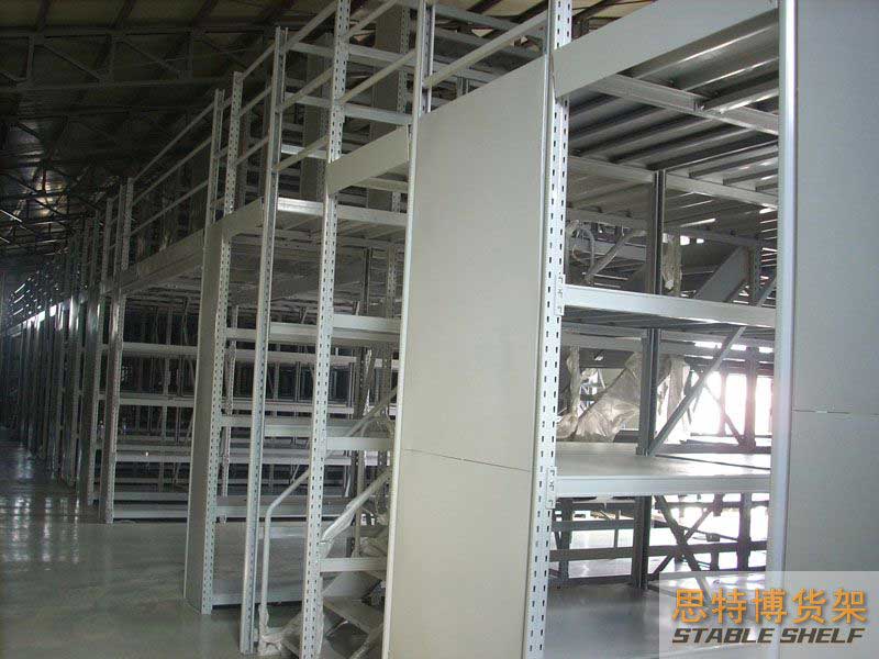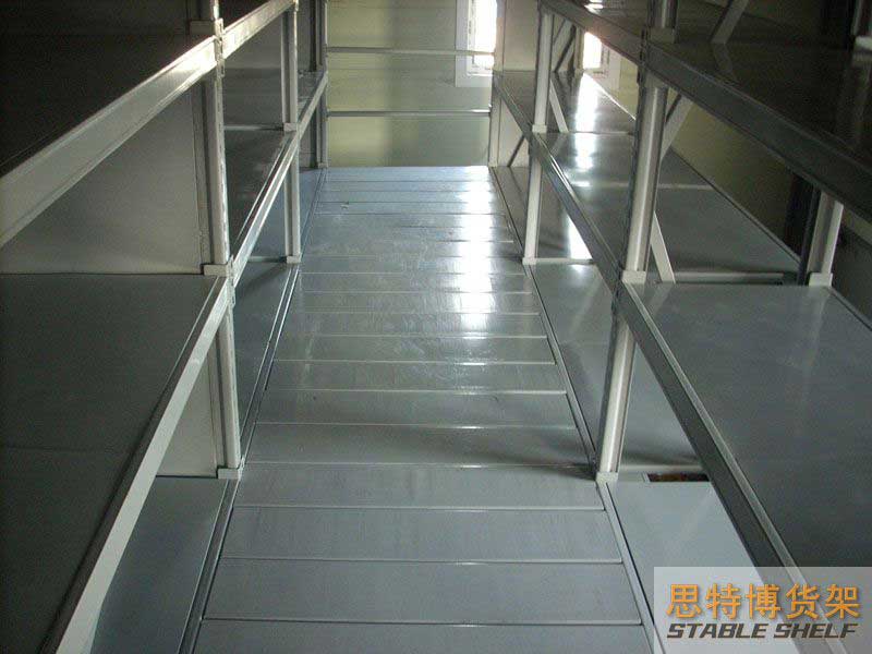 閣樓貨架系統(tǒng),通常利用中型擱板式貨架或重型擱板式貨架作為主體支撐加上樓面板(根據(jù)貨架單元的總負(fù)載重量來決定使用何種貨架),樓面板通常使用冷軋型鋼樓板、花紋鋼樓板或鋼格柵樓板。