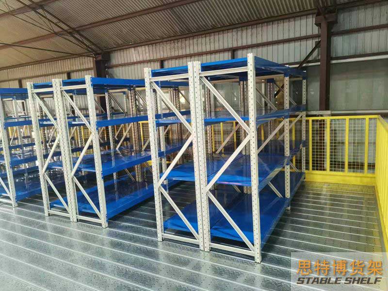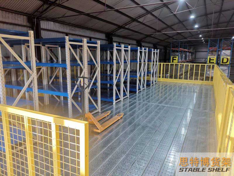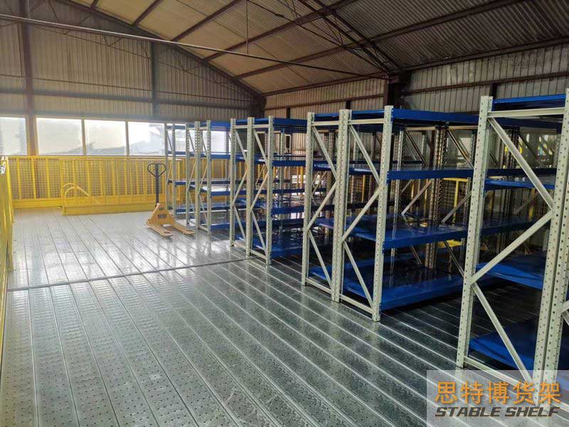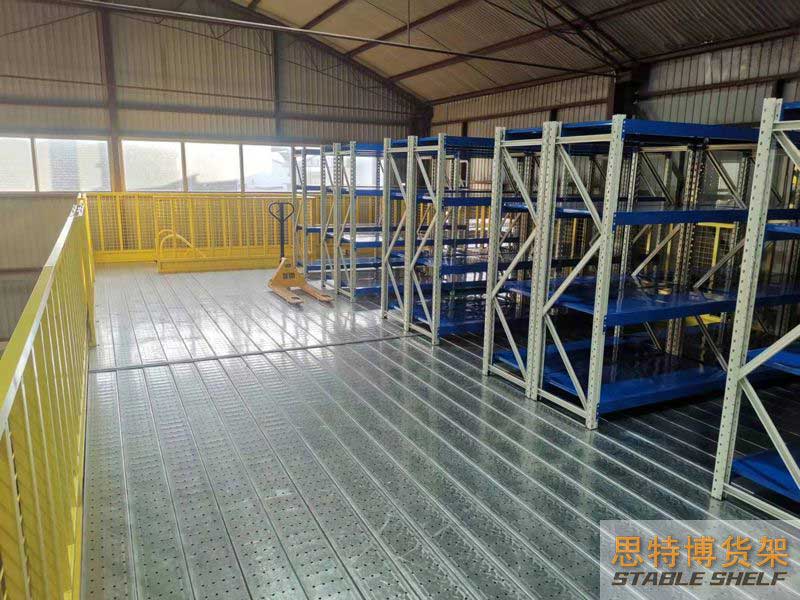 閣樓貨架系統(tǒng),通常利用中型擱板式貨架或重型擱板式貨架作為主體支撐加上樓面板(根據(jù)貨架單元的總負(fù)載重量來決定使用何種貨架),樓面板通常使用冷軋型鋼樓板、花紋鋼樓板或鋼格柵樓板。