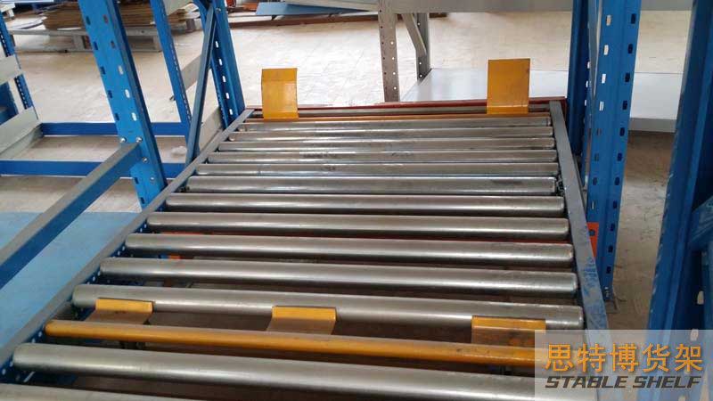 The gravity shelf is also called the roller shelf, which belongs to the pallet storage shelf in the storage shelf. The gravity shelf is one of the derivatives of the beam shelf, the shelf structure is similar to the beam shelf, but the drum track is installed on the beam, and the track is tilted 3-5°. Pallet goods are transported by forklift to the purchase port of the shelf, and the pallet automatically glides from the entrance to the pick-up port at the other end by using its own weight. The gravity shelf is a first-in-first-out storage method.
