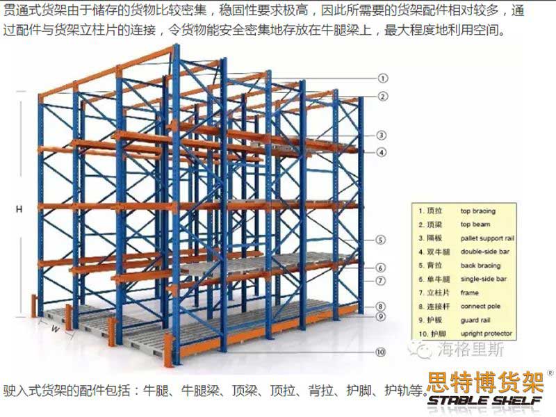 貫通式貨架又稱為駛?cè)胧截浖芑蛲ɡ刃拓浖?是一種不以通道分割的、連續(xù)性的整棟式貨架
