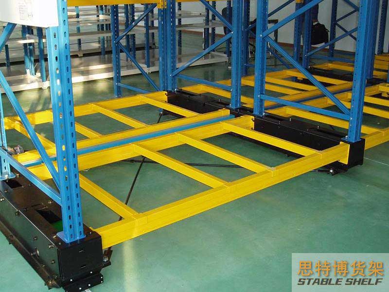 Two rows of back-to-back shelves are installed in a group on a moving chassis, arranged in a number of groups, each chassis is equipped with a number of rollers and drive motors, by pressing the control button, the drive motor drives the whole chassis and the goods on the shelf through the chain transmission, along the ground two or more tracks (or trackless - magnetic strip guide), Thus, the forklift can enter the site that has been moved to access the goods.